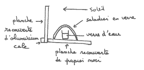 Je me demande à quoi sert le saladier (en verre) qui recouvre un verre d'eau, dans le cas d'une modélisation d'un four solaire. N'y a t'il pas réverbération des rayons au niveau du verre d'eau?