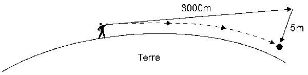 Vous y êtes presque ! En réalité, quand on parcourt une ligne droite (tangente à la surface de la Terre) pendant 8 000 mètres, on s'élève par rapport au sol d'une distance de 5 mètres.