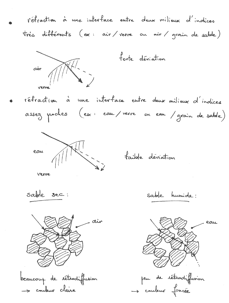 Le sable sec est, en quelque sorte, un mélange d'air et de roche plus ou moins transparente et finement divisée, alors que le sable mouillé est un mélange de cette même roche avec de l'eau. Le changement d'aspect du sable vient de ce que l'indice de réfraction (qui mesure la vitesse de propagation de la lumière dans un milieu) de l'eau est différent de celui de l'air et cela change beaucoup le trajet de la lumière. Pour comprendre pourquoi, il faut faire un petit dessin, que j'ai joint à mon explication (voir plus bas). Tout d'abord, remontons au cas simple d'un rayon réfracté une fois par une surface : toutes choses étant égales par ailleurs, le rayon est d'autant plus dévié que la différence d'indice entre les deux milieux est élevée. Donc si on remplace l'air (indice 1) par de l'eau (indice 1,33 environ), le rayon est moins dévié, l'indice de la roche étant toujours supérieur à celui de l'eau (on peut prendre 1,5 par exemple). Le trajet des rayons lumineux traversant de nombreuses surfaces de grains de sable sera donc beaucoup plus "zigzagant" dans le sable sec que dans le sable mouillé, avec pour conséquence que la lumière pénètre en moyenne moins profondément dans le sable, a moins de chance d'y être absorbée et revient en plus grande partie vers l'observateur (d'où une teinte plus claire). C'est en fait le même phénomène que celui "du papier gras" : lorsqu'on achète des beignets bien gras qu'on nous sert dans du papier, on voit rapidement celui- ci devenir presque transparent car l'huile vient se mettre entre les fibres du papier (jusque-là entourées d'air) et la lumière, au lieu d'être fortement rétrodiffusée par le papier, devient capable de le traverser en grande partie. Le papier gras apparaît "plus sombre" si on le regarde au-dessus d'un fond sombre, mais aussi et surtout plus transparent, parce qu'on a accès aux deux côtés. Eh bien, si on pouvait mettre son œil sous quelques millimètres de sable humide, on verrait qu'il est nettement plus transparent que le sable sec... d'ailleurs c'est une expérience facilement réalisable, en mettant une fine couche de sable dans un plat en verre par exemple, et en comparant par en-dessous la transparence à la lumière de cette couche, sèche ou humide ! Je n'ai pas encore fait l'expérience, mais je vous encourage à la faire.