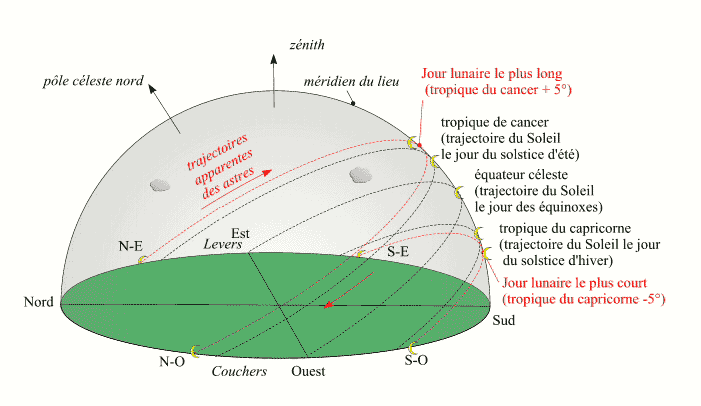 Pour la Lune c'est la même chose, lorsque sa déclinaison (hauteur par rapport à l'équateur) décroît, le « jour » lunaire décroît et lorsque la déclinaison croît le « jour » lunaire croît. Il y a égalité lorsque la déclinaison de la Lune est nulle (Lune dans l'équateur). Le dessin ci dessous, nous montre le trajet journalier du soleil aux différentes saisons, il peut être repris en remplaçant le soleil par la Lune. Plus l'arc de trajectoire au-dessus de l'horizon est long, plus le jour lunaire sera long. Les grandes variations de la durée du jour lunaire proviennent des variatoins rapides de sa déclinaison de la Lune. La déclinaison lunaire peut varier au maximum entre +28° et -28° et au minimum entre +18 et -18° en 27,32 jours.