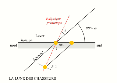 Donc au lever de la pleine Lune à Paris au voisinage de l'équinoxe de printemps, la Lune des chasseurs, l'écart entre deux levers de Lune est supérieur à 48 min (valeur moyenne), il est de l'ordre de 1h 15 mn à 1h 30 mn.