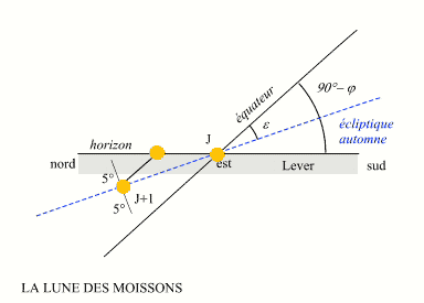 Donc aux levers de la pleine Lune à Paris au voisinage de l'équinoxe d'automne, la Lune des moissons, l'écart entre deux levers de Lune est inférieur à 48 mn, il est de l'ordre de 15 à 35 minutes.