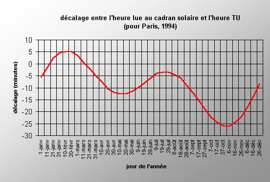 Précisions sur la figure : Pour obtenir l'heure TU à partir de l'heure donnée par le cadran solaire, il faut ajouter le nombre de minutes donné par le graphique ci-dessus. Par exemple, si on lit 14H le 1er janvier sur le cadran solaire, il est 13H55 TU (à Paris). Pour obtenir l'heure civile, il faut rajouter un heure (deux si on est en été) : il sera donc 14H55 à la montre. Si on est à une longitude différente de celle de Paris (4°20'), il faut retrancher 4 minutes de temps pour chaque degré plus à l'est.