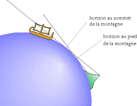 Depuis 1968 et les premiers clichés de clair de Terre vu de la Lune faits par l'équipage d'Apollo 8, il est évident pour tout le monde que la Terre est une boule bleue et blanche. Par ailleurs, si l'on a la chance de voyager en avion un jour où le ciel est clair, la courbure l'horizon apparaît nettement, dès que l'appareil est à haute altitude. Mais comment percevoir la rotondité de la Terre en restant à sa surface? Dans l'Antiquité, il y a plus de deux mille ans, alors que les fusées et les avions n'existaient pas encore, des hommes pensaient déjà que la Terre était ronde. Au niveau de la mer, la courbure de l'horizon ne saute pas aux yeux. Cependant, lorsqu'on regarde des gros bateaux s'éloigner d'un port, on les voit passer progressivement sous la ligne d'horizon. Cela ne se produirait pas si la Terre était plate. Quand on peut, comme en Grèce, observer la mer du sommet d'une montagne, on voit nettement plus loin que lorsqu'on se situe en contrebas, au niveau de la mer: on constate alors que l'horizon "recule" (voir le schéma ci-dessous).