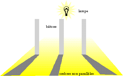 Hypothèse 1 : la Terre est plate. Les ombres de deux bâtons très éloignés en latitude ont, le même jour, à midi heure solaire locale, des ombres de même longueur.