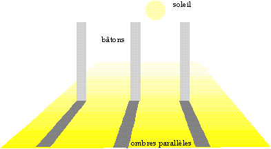 Il est cependant indispensable de démontrer que les rayons solaires arrivent de façon parallèle sur la Terre. En effet, les ombres de divers objets verticaux (immeubles, arbres) sont parallèles quand le soleil les éclaire, mais divergent fortement lorsqu'elles sont éclairées par une source de lumière plus proche.