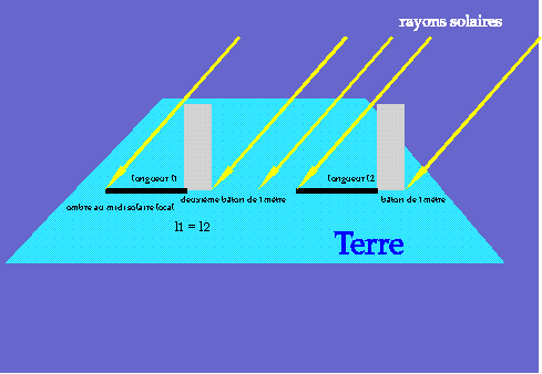 Hypothèse 2 : La Terre est sphérique. Les ombres de deux bâtons très éloignés en latitude ont, le même jour, à midi heure solaire locale, des ombres de longueur différente. Dans l'hémisphère Nord, l'ombre est d'autant plus grande que la latitude est plus élevée.