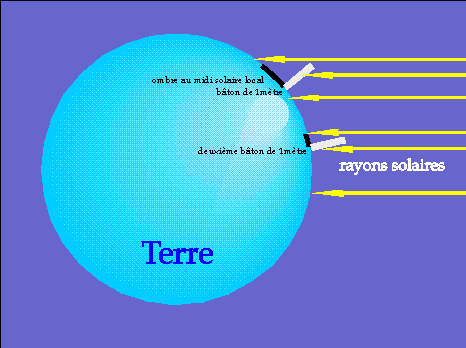 Il est aussi possible, mais c'est bien plus compliqué, de s'inspirer de l'expérience historique d'Eratosthène qui, dès le IIIe siècle avant J.C., permit d'estimer la taille du méridien entre Syène et Alexandrie (ce qui fournit une estimation du rayon terrestre).